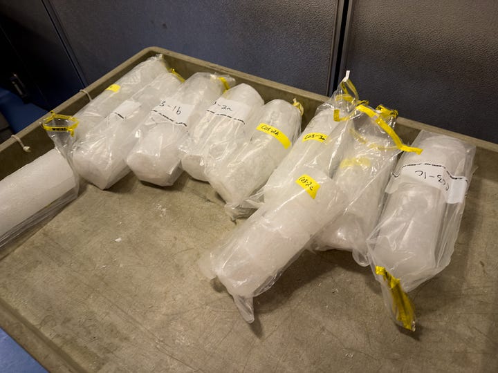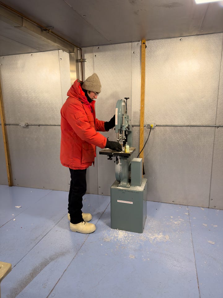 I was able to get a little bit closer to the action last weekend, the action being science. A friend I met in Christchurch, Gavin, was doing research in the dry valleys (across the water from McMurdo) along with his friend Joe who is in the same research group. Joe got back a bit earlier and brought some ice core samples that he needed to process. He’s part of the stream team of the McMurdo Dry Valleys LTER (Long Term Ecological Research) group. There are a ton of LTERs across the US and a few locations around the world, each measuring changes to the ecology over decades, rather than the normal research grant cycle of maybe 5 years. For Joe specifically, he was measuring the sediment that accumulates in glaciers in the dry valleys. He and Gavin would hike around and manually take small ice core samples from a bunch of different locations. Then, he brought them all back to McMurdo, which is where I got to start helping out for a day. Each one is 25cm long and 7.8cm in diameter, unless there was melt that happened at some point along its journey. We grabbed the core samples, each individually bagged and labeled, from the -20C freezer and took them to a -30C freezer that has a band saw in it. One by one, we opened up each ice core sample, measured its length and weight, then used the band saw to cut it into 5cm segments, then went around and removed any of the melted and refrozen ice, which was visibly pretty easy to discern.